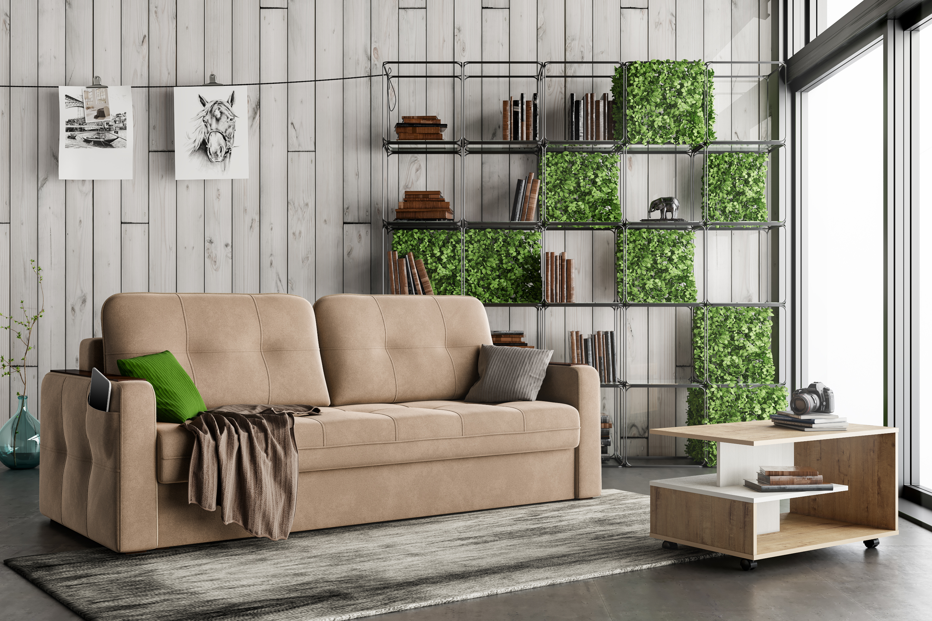 Современный диван «SMART 3» легко вписывается в пространство любого интерьера – и классического и оформленного в стиле минимализма. Лаконичная форма не отменяет комфорта. Диван, несмотря на отсутствие излишнего декора, очень удобен для использования. Механизм раскладывания "пантограф" не требует отодвигания дивана от стены и работает из стационарного положения дивана. Благодаря наличию накладок, на подлокотники можно положить смартфон или поставить чашку, что обеспечивает полезную рабочую поверхность. В комплекте к дивану можно заказать кресло-кровать или кресло с бельевым ящиком.