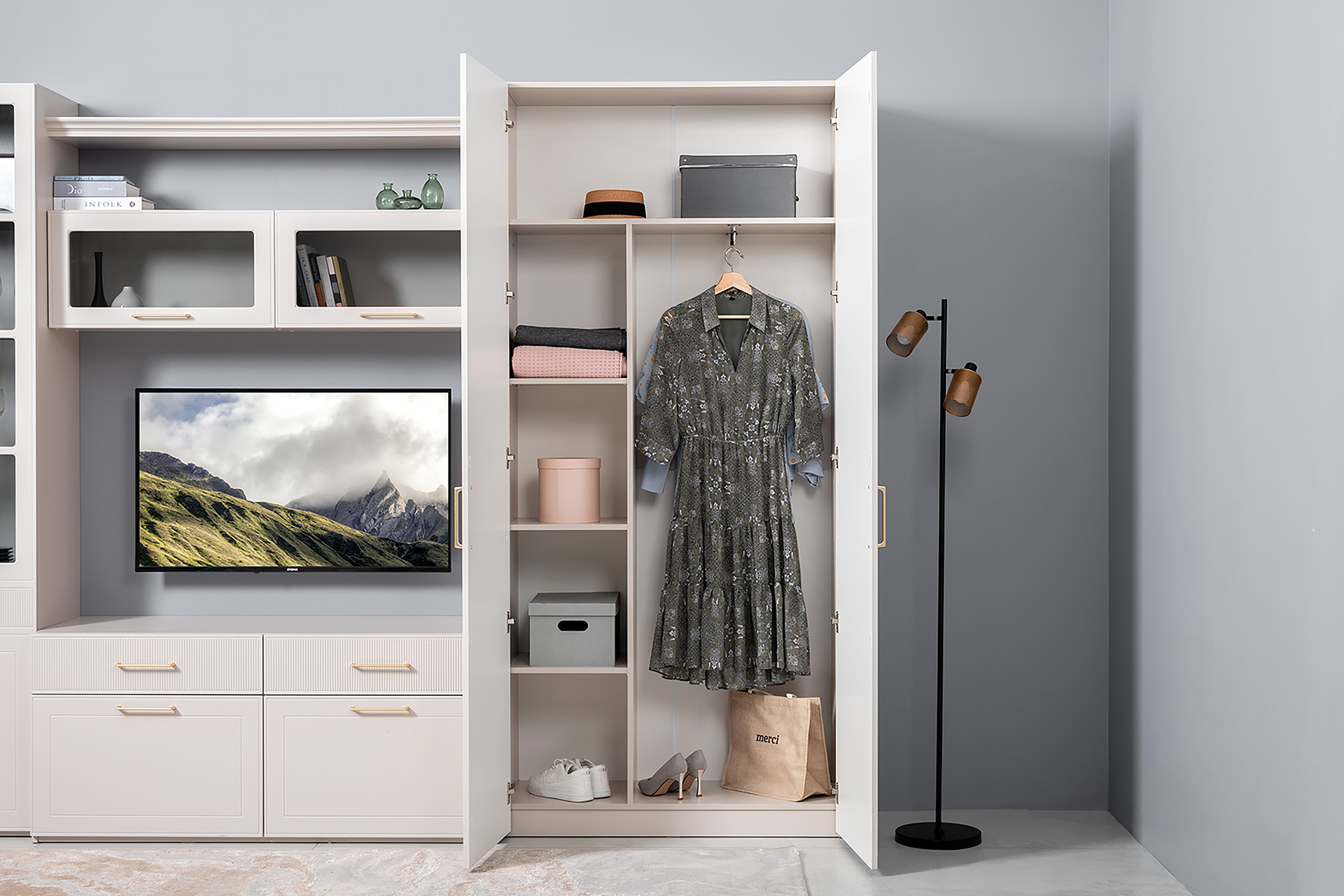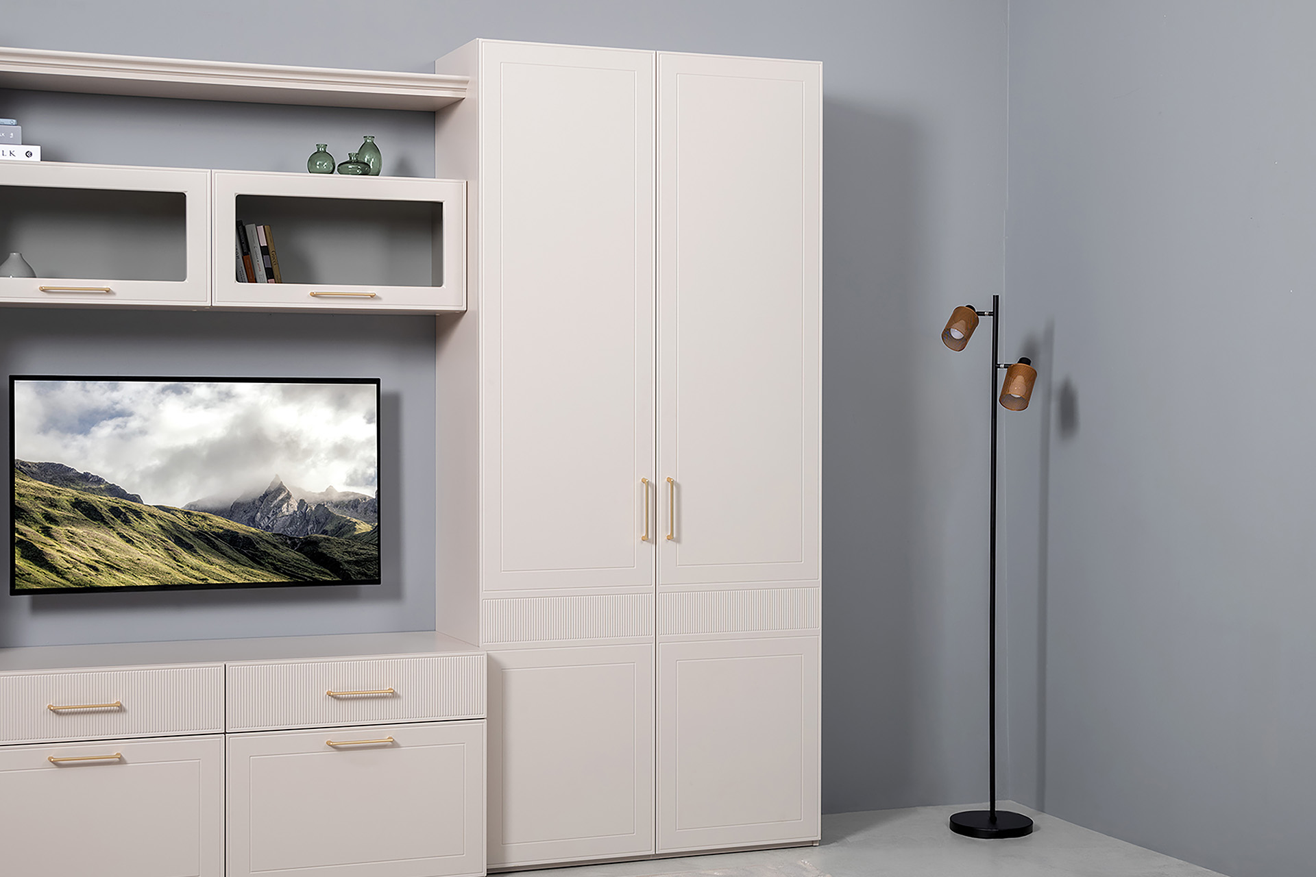Гостиная Ричфорд композиция 1 с карнизами, кашемир 5981 BS, моно керамика D166-2 ПВХ, белый PE шагрень (собирается на любую сторону)