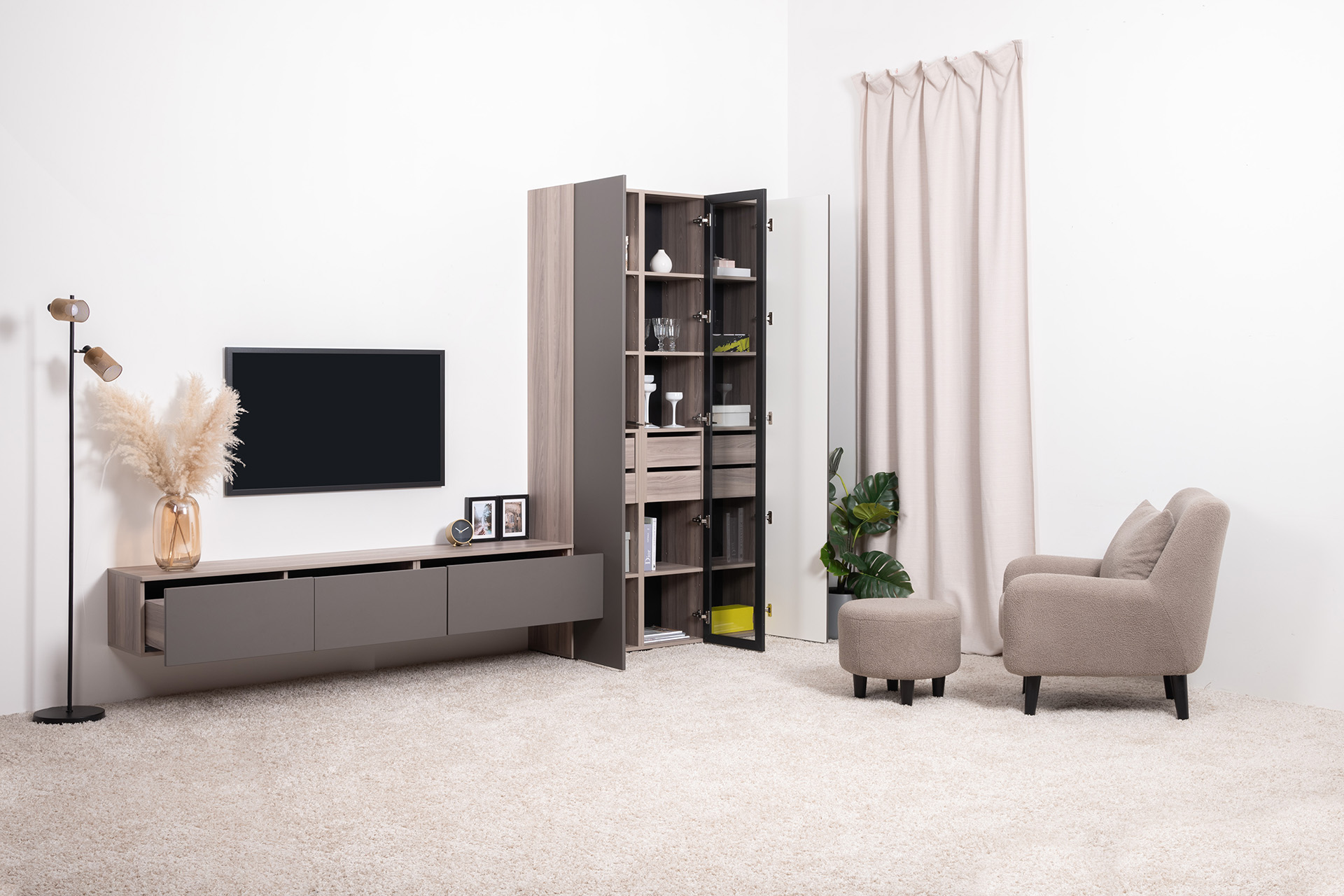 Разнообразие модулей и возможность их напольной и настенной установки позволит создать гостиную оптимальной конфигурации. Распашные фасады с механизмом push-to-open, направляющие скрытого монтажа в ящиках, петли с доводчиками, регулируемые опоры, крепеж в комплекте – комфорт продуман до мелочей.