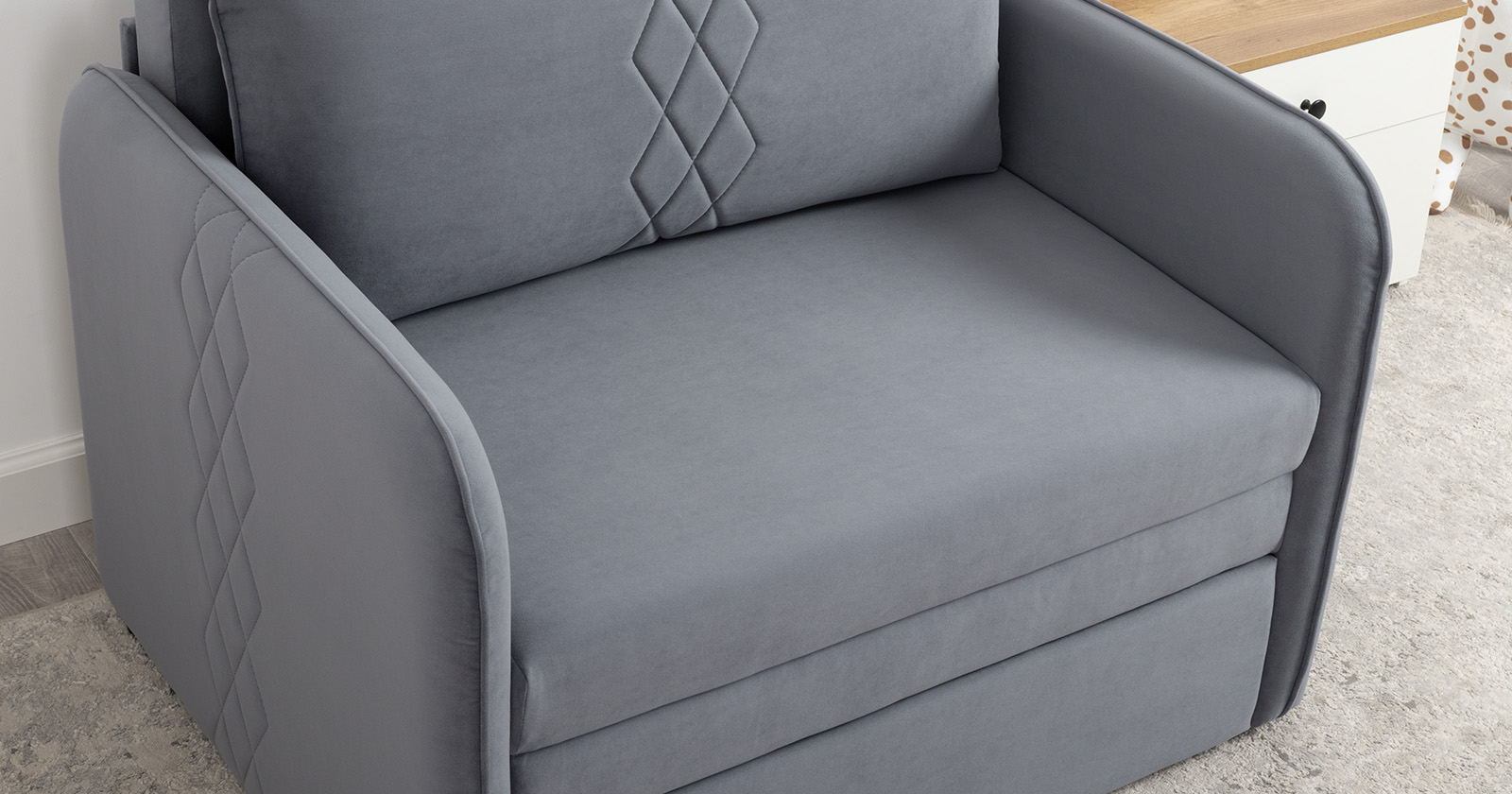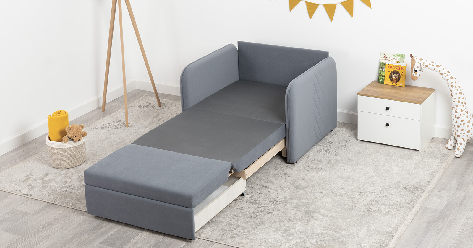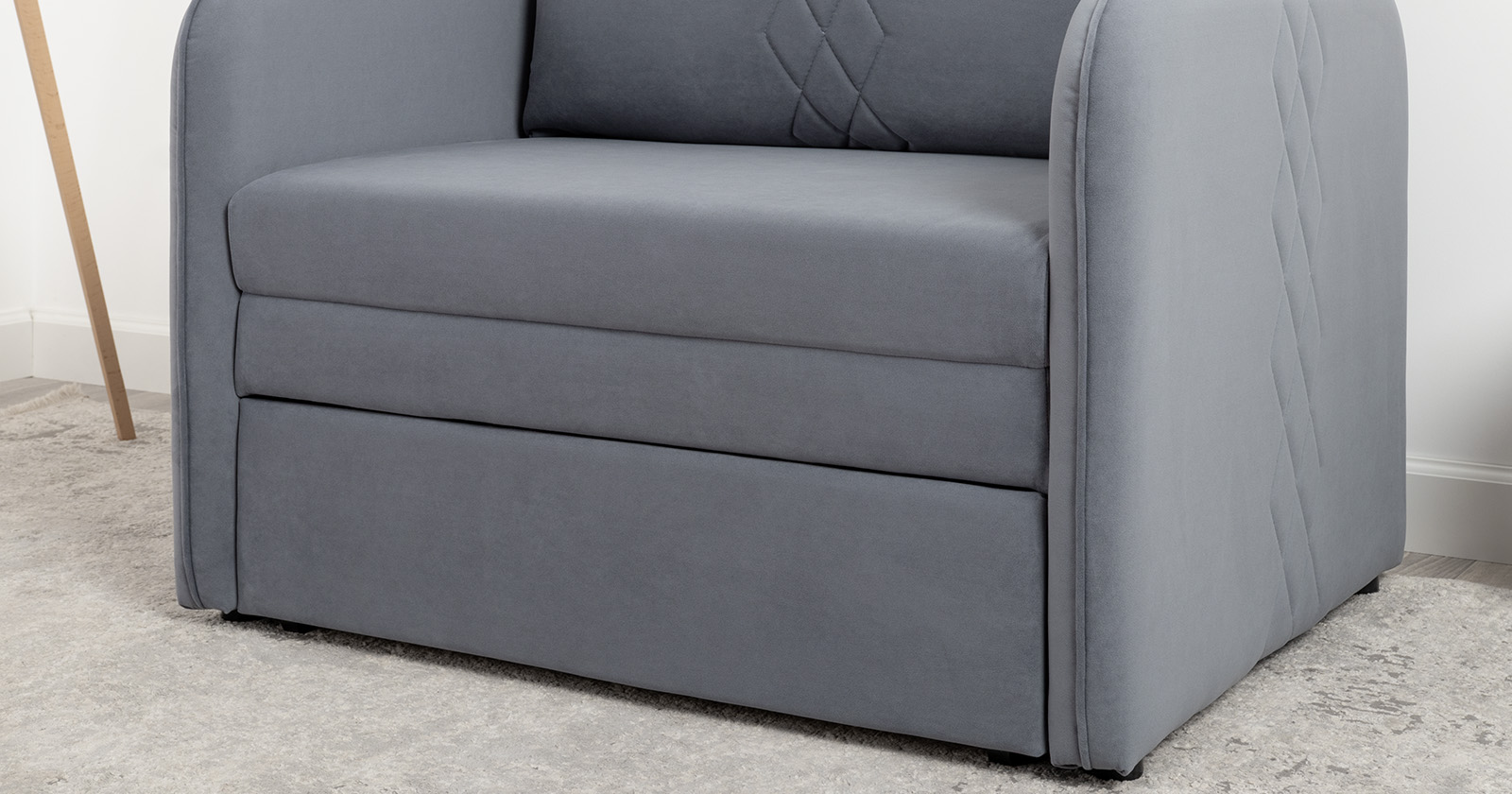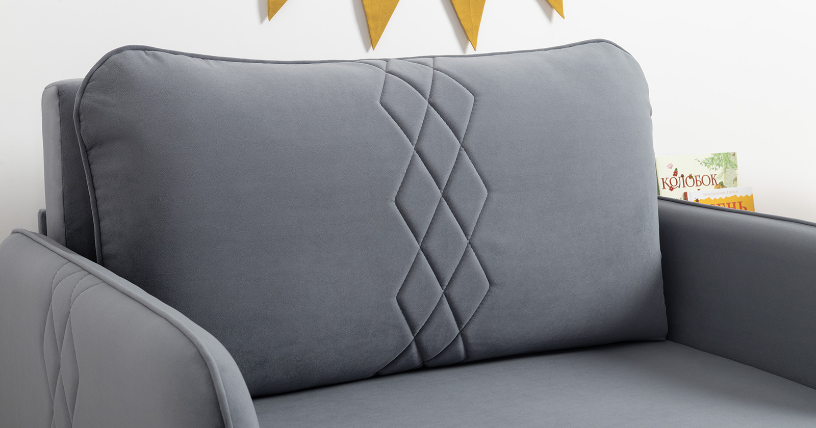 Стильный компактный диван для детской и гостиной. При своих скромных размерах он трансформируется в полноценное спальное место для детей и подростков. Лаконичный дизайн в виде декоративной стежки подчеркивает фактуру велюра, а небольшие размеры позволят разместить его в любом пространстве.