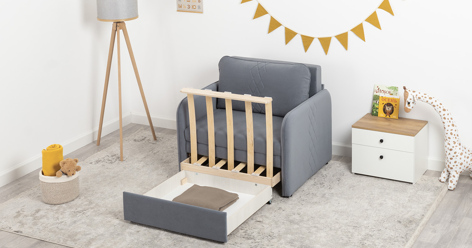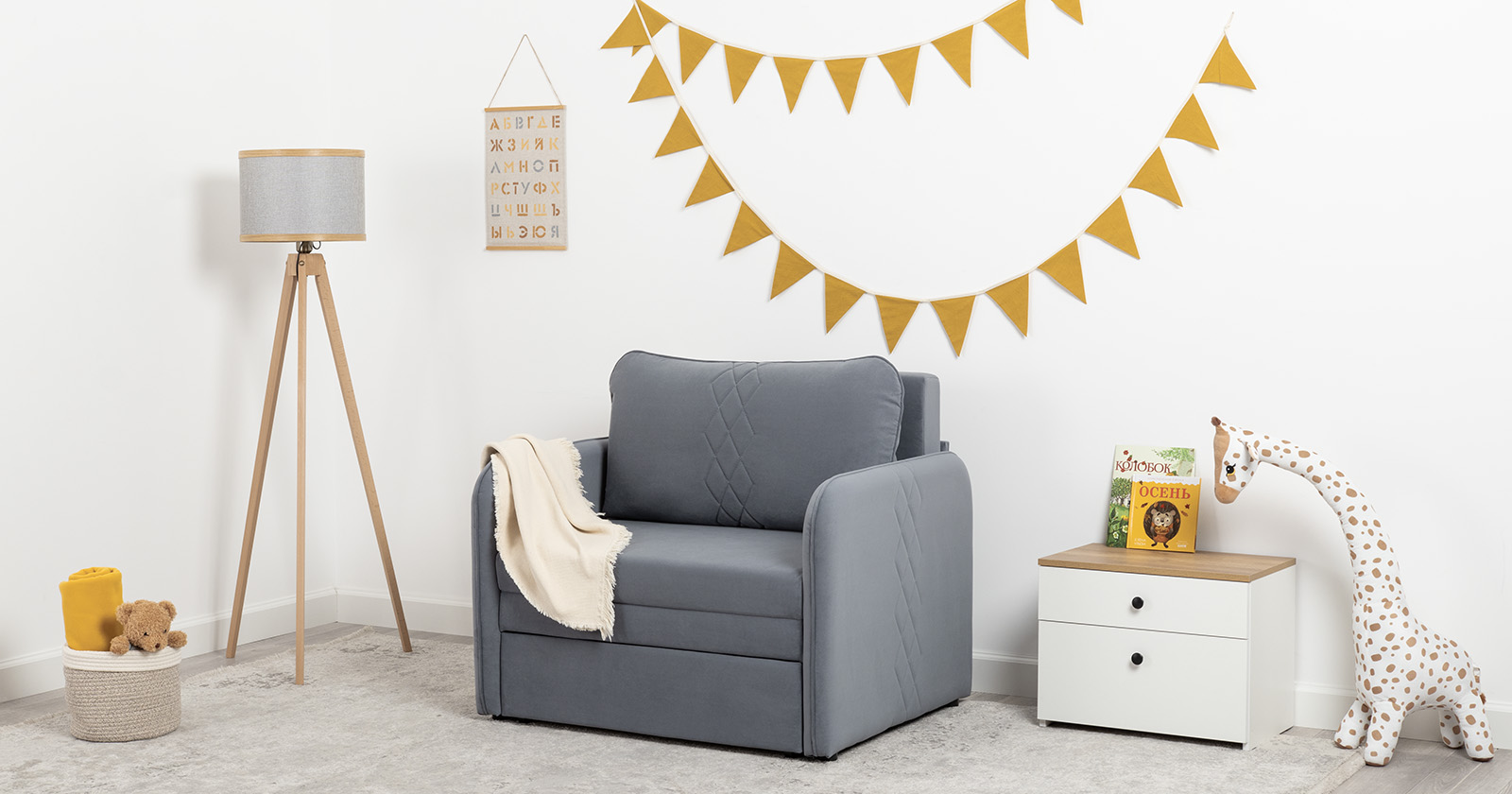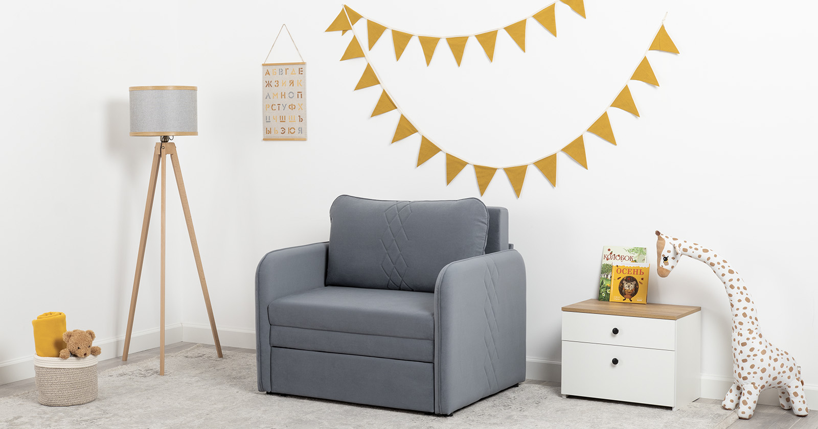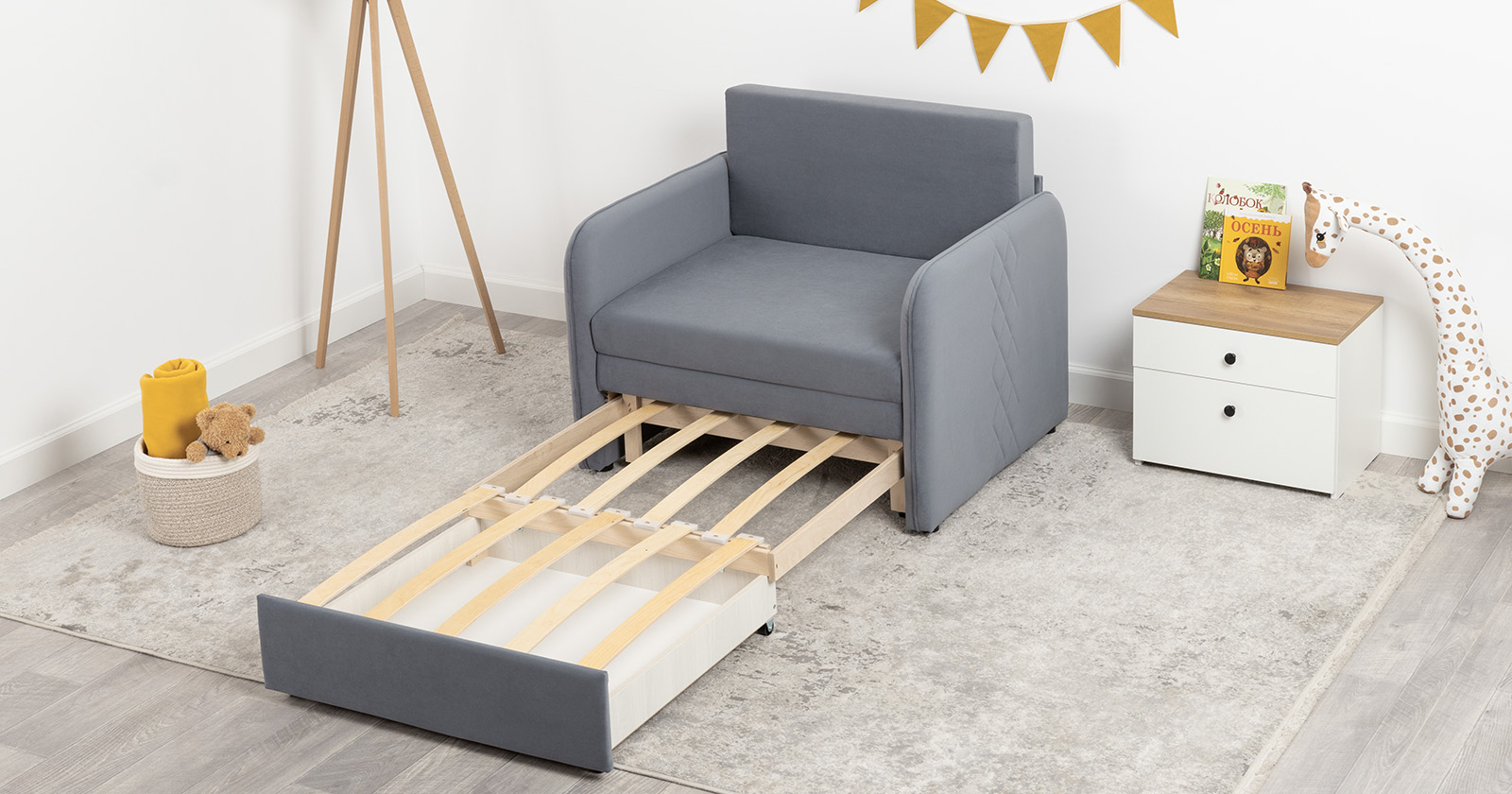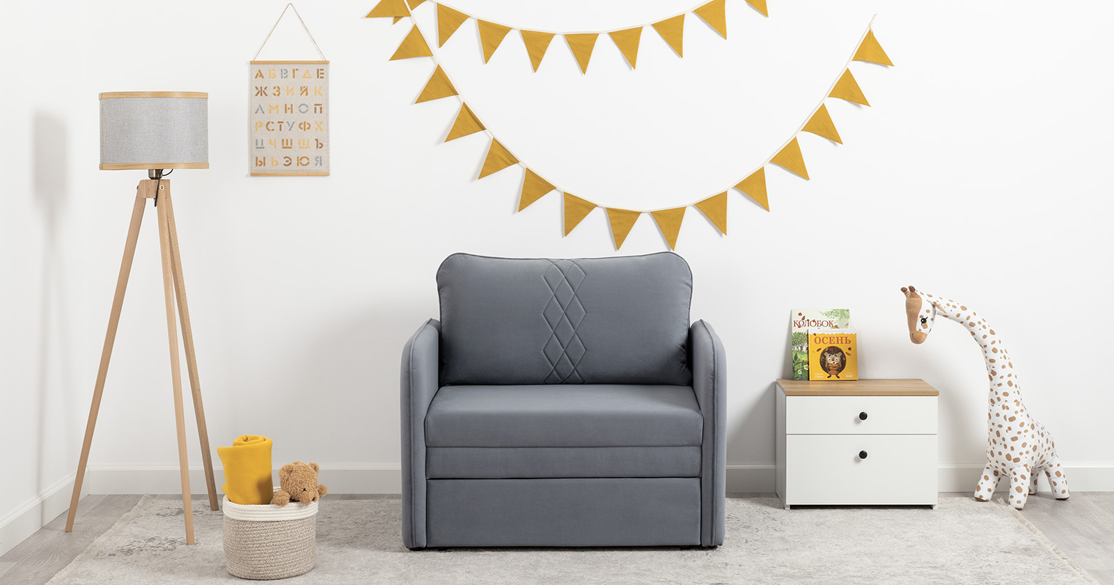 Стильный компактный диван для детской и гостиной. При своих скромных размерах он трансформируется в полноценное спальное место для детей и подростков. Лаконичный дизайн в виде декоративной стежки подчеркивает фактуру велюра, а небольшие размеры позволят разместить его в любом пространстве.