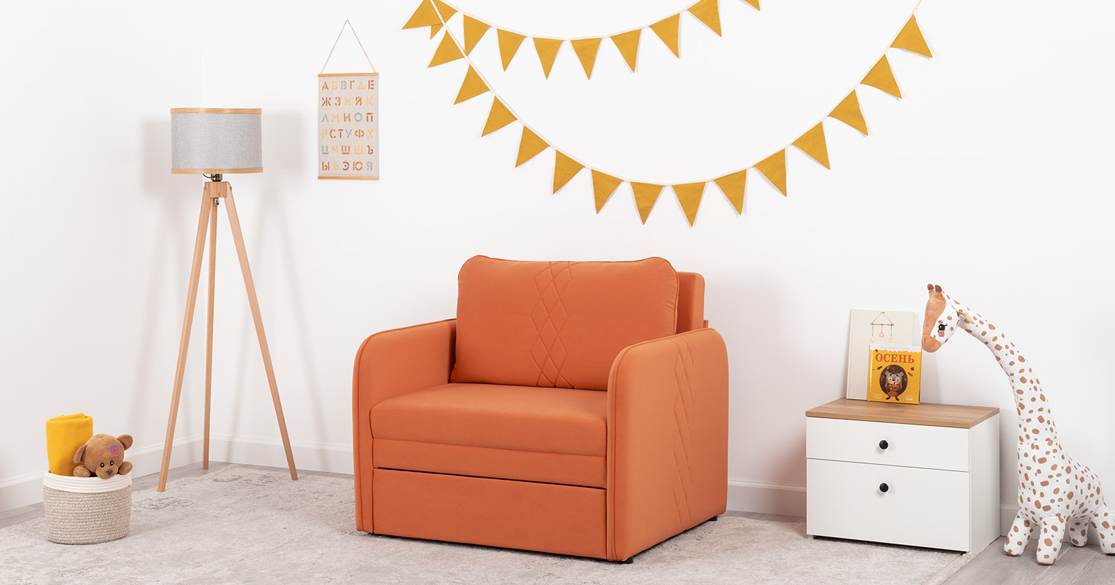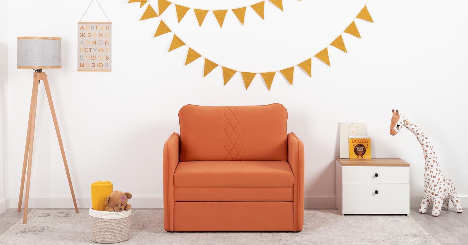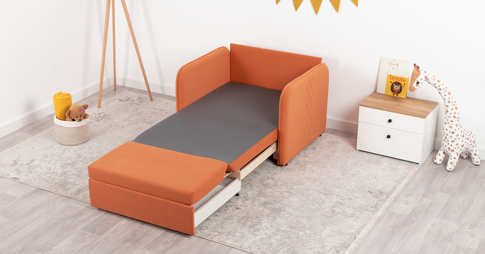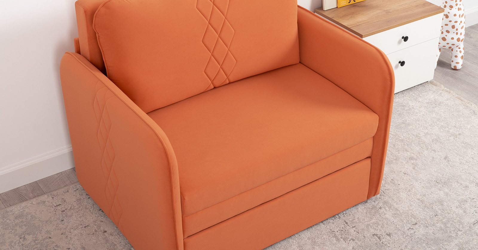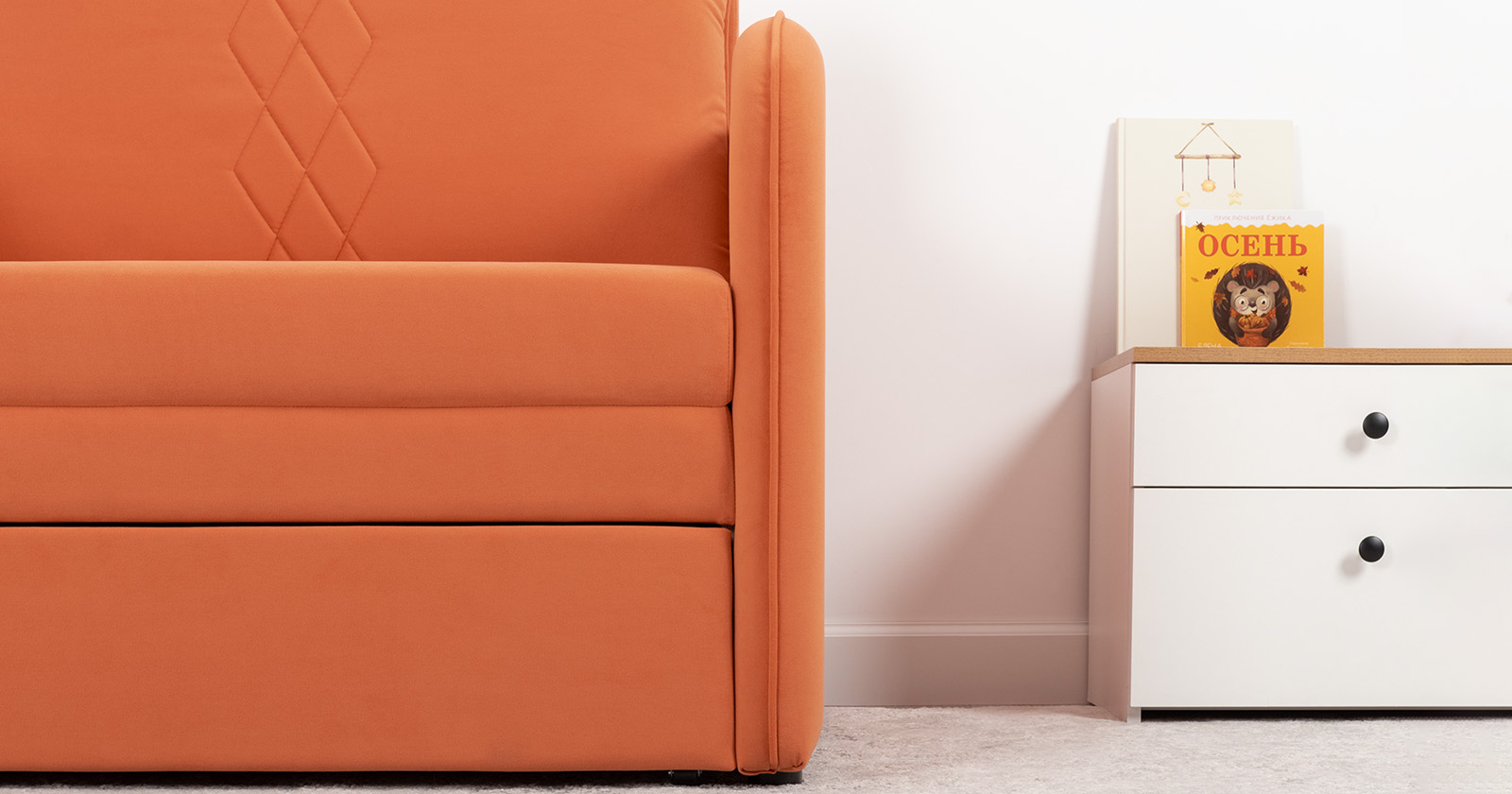 Стильный компактный диван для детской и гостиной. При своих скромных размерах он трансформируется в полноценное спальное место для детей и подростков. Лаконичный дизайн в виде декоративной стежки подчеркивает фактуру велюра, а небольшие размеры позволят разместить его в любом пространстве.