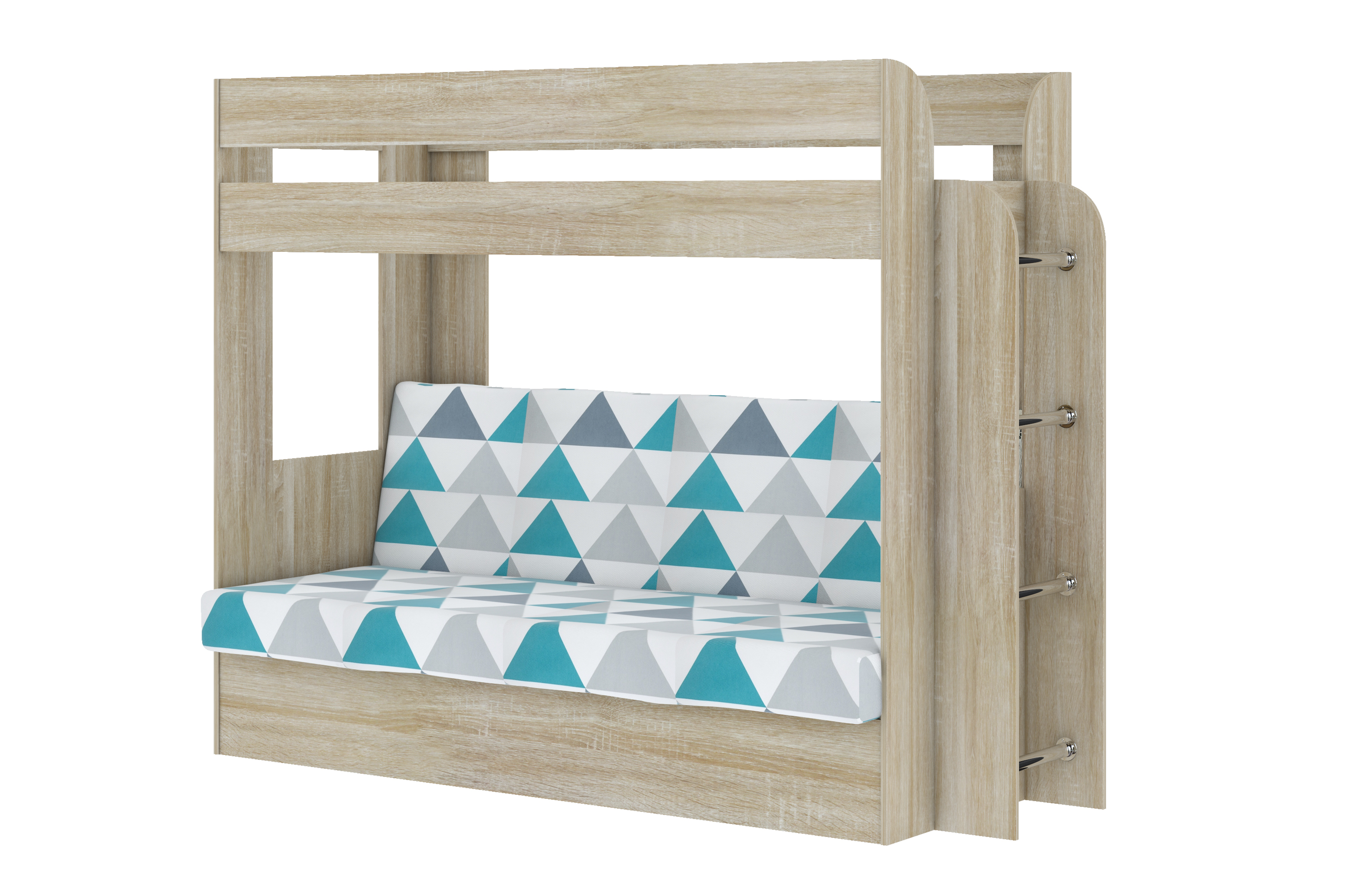 Кровать детская двухъярусная Карамель 75 Дуб Сонома, диван - велюр NILS MINT бирюзовые треугольники (сборка на любую сторону) спальное место верх 80х190, низ 120х185