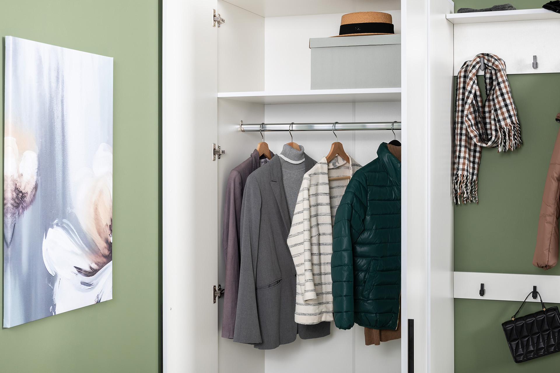 Нейтральный белый цвет визуально расширит ограниченное пространство прихожей.