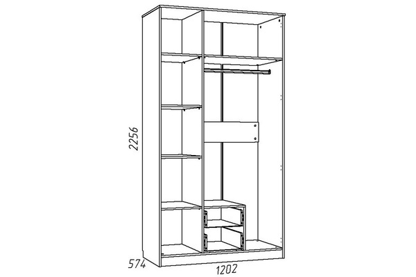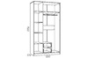 Данный шкаф имеет компактные размеры, но, при этом многофункционален. Внутри модуля предусмотрены овальная штанга для одежды на вешалках, в том числе для размещения длинных вещей. Вместительная часть с пятью полками, позволит рассортировать и разместить большое количество вещей.  Два выдвижных ящика внизу идеальны для хранения мелкой одежды. Классические глухие фасады надежно защитят содержимое шкафа от влаги и пыли.
