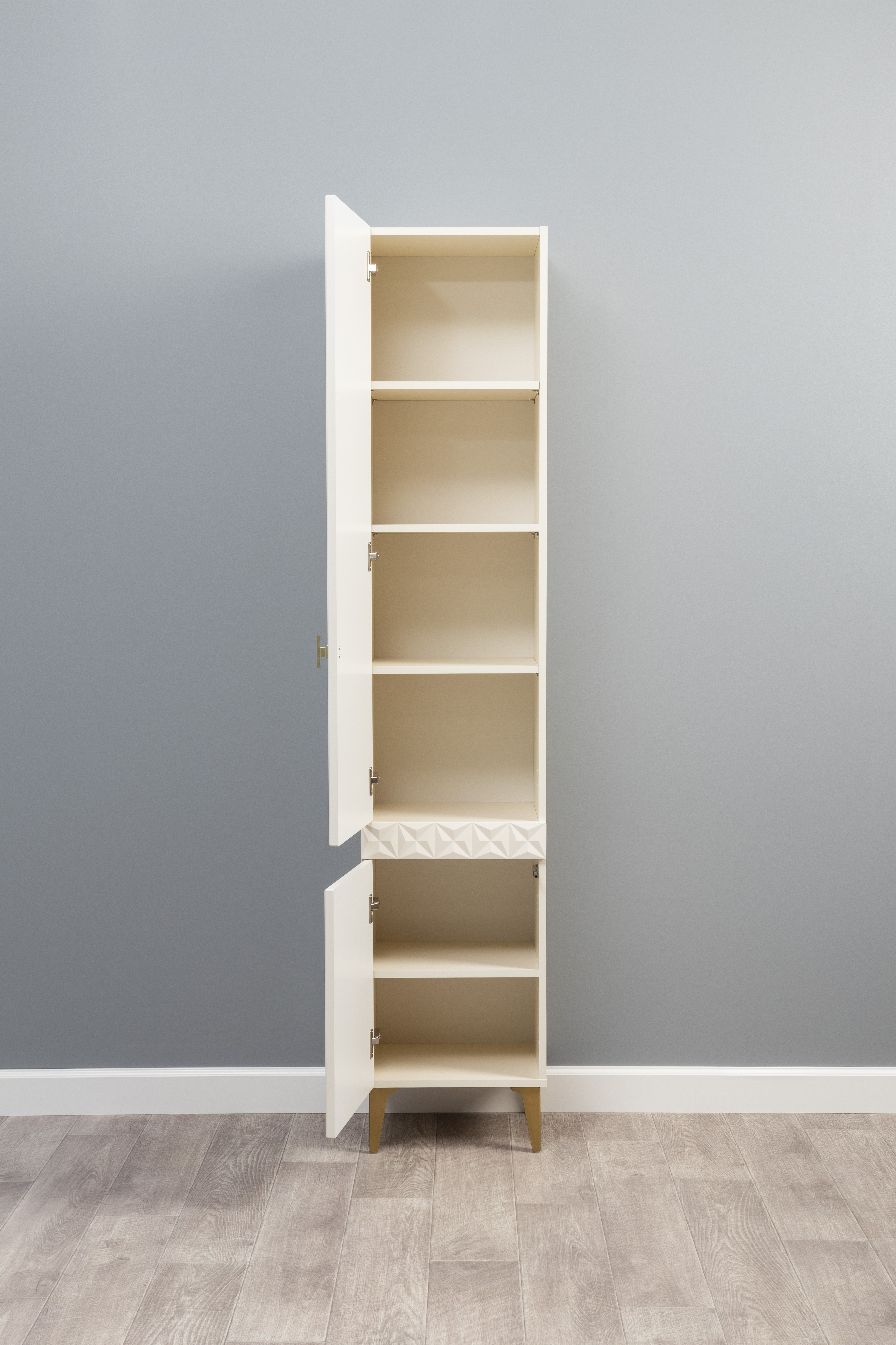 Изящные линии, глубокая фрезеровка фасадов из МДФ и благородные оттенки. Утончённая «Слоновая кость» и изысканная «Олива Шагрень» с глубоким зелёным тоном — создают атмосферу уюта, тепла и благородства. Металлические ручки и опоры золотого цвета придают мебели утончённый блеск, а петли и направляющие с доводчиками обеспечивают плавное и бесшумное закрытие фасадов.