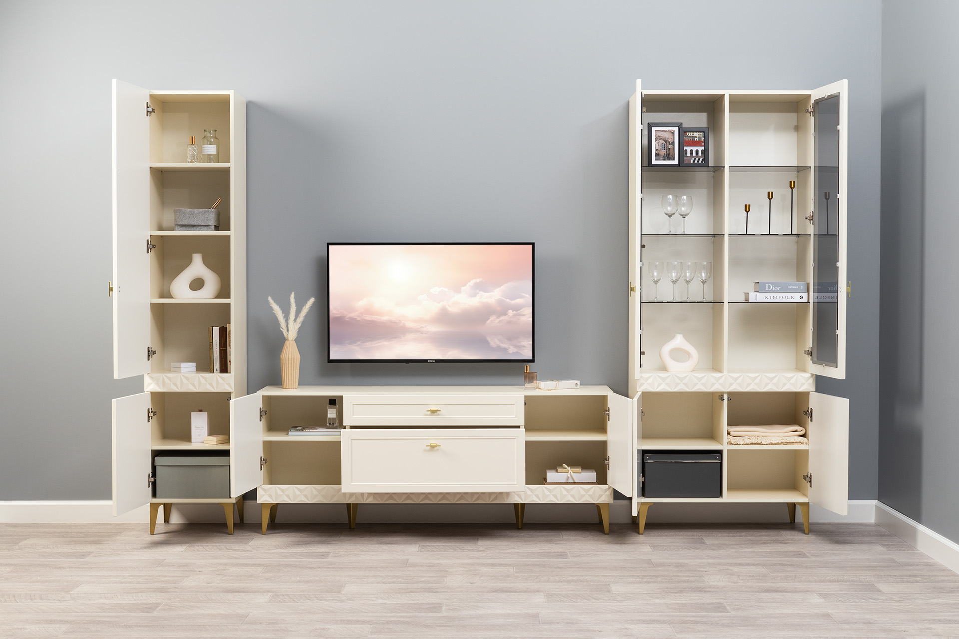 В коллекции представлены три типа витрин с тонированным закалённым стеклом, которые придают пространству лёгкость и свет. «Марион» — идеальное сочетание традиций и актуального дизайна в каждой детали.