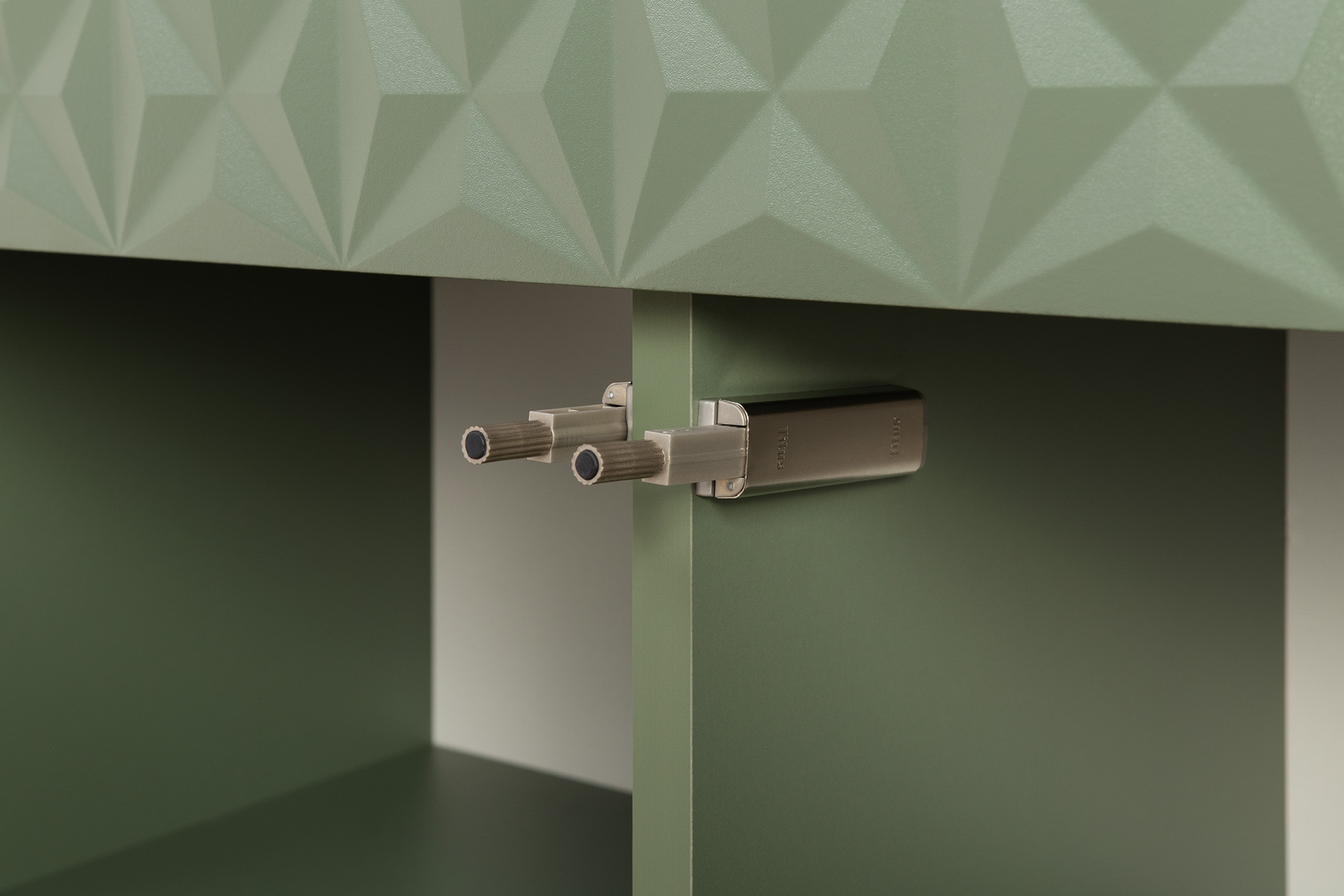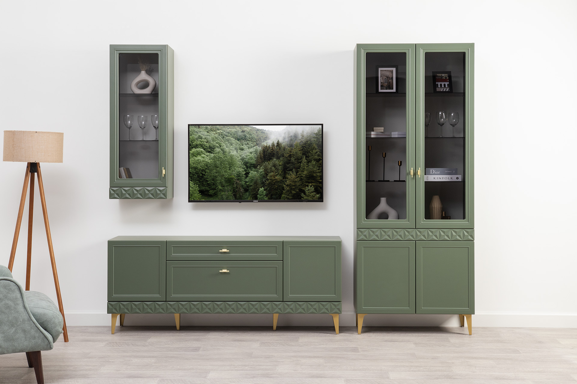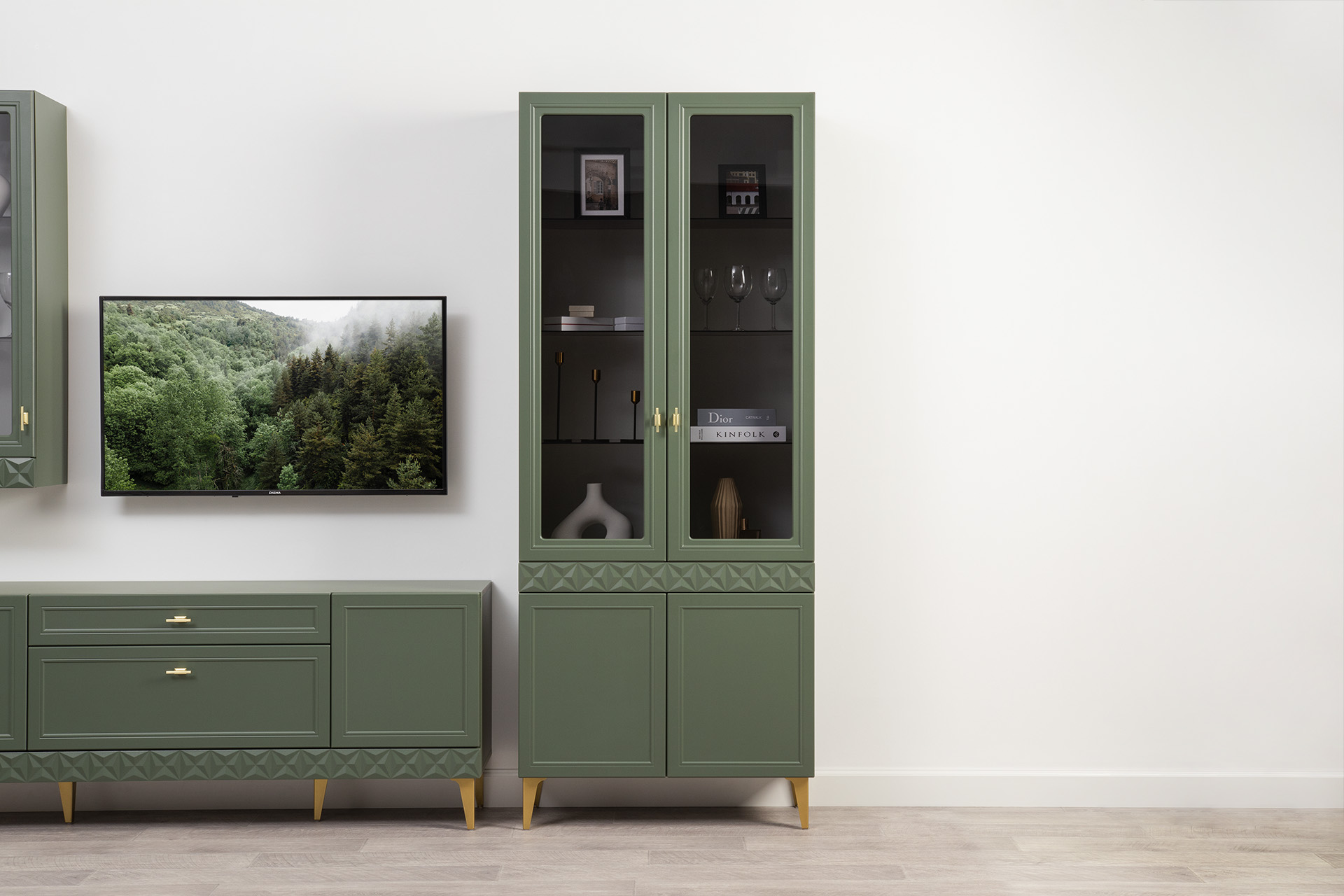 Изящные линии, глубокая фрезеровка фасадов из МДФ и благородные оттенки. Утончённая «Слоновая кость» и изысканная «Олива Шагрень» с глубоким зелёным тоном — создают атмосферу уюта, тепла и благородства. Металлические ручки и опоры золотого цвета придают мебели утончённый блеск, а петли и направляющие с доводчиками обеспечивают плавное и бесшумное закрытие фасадов.