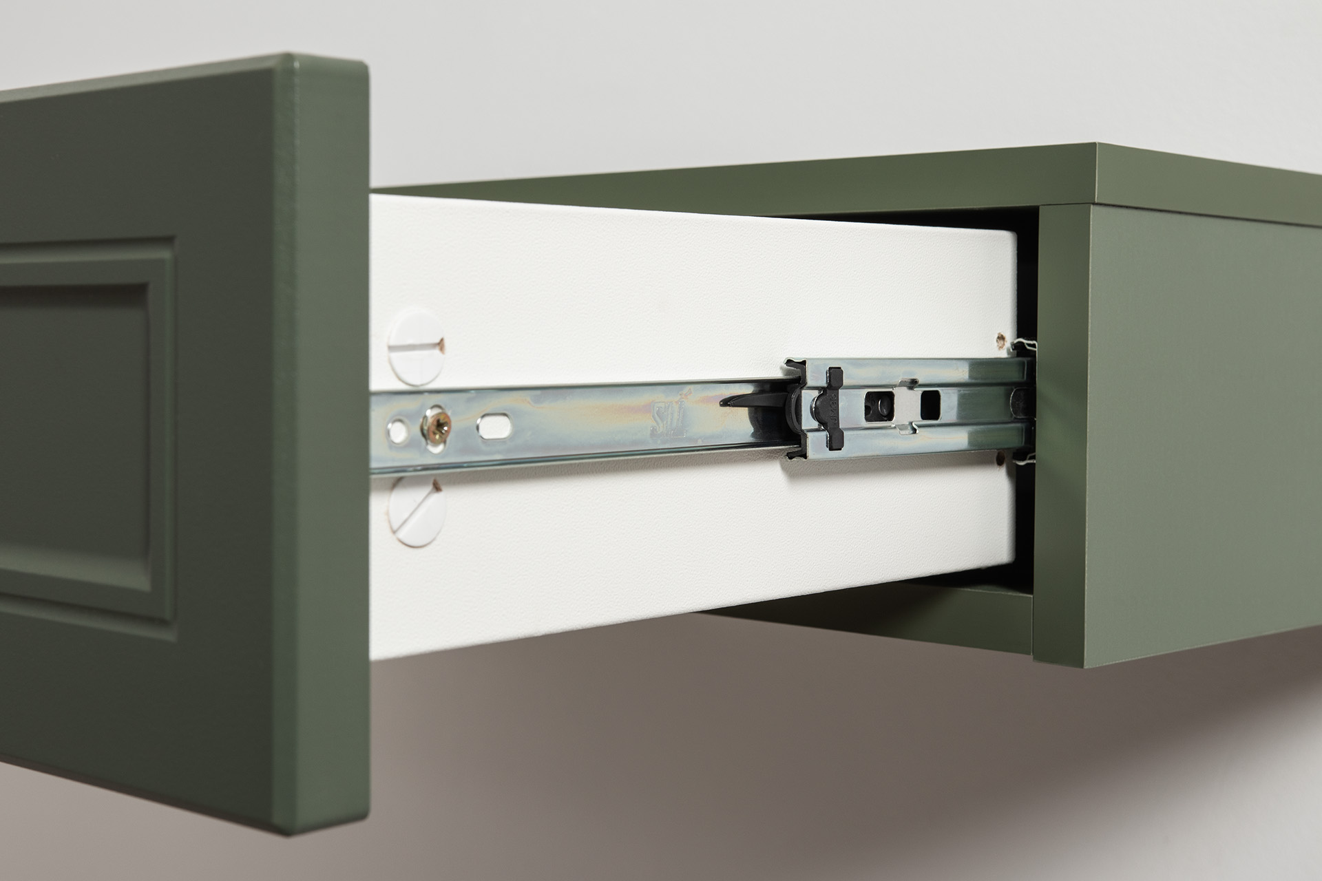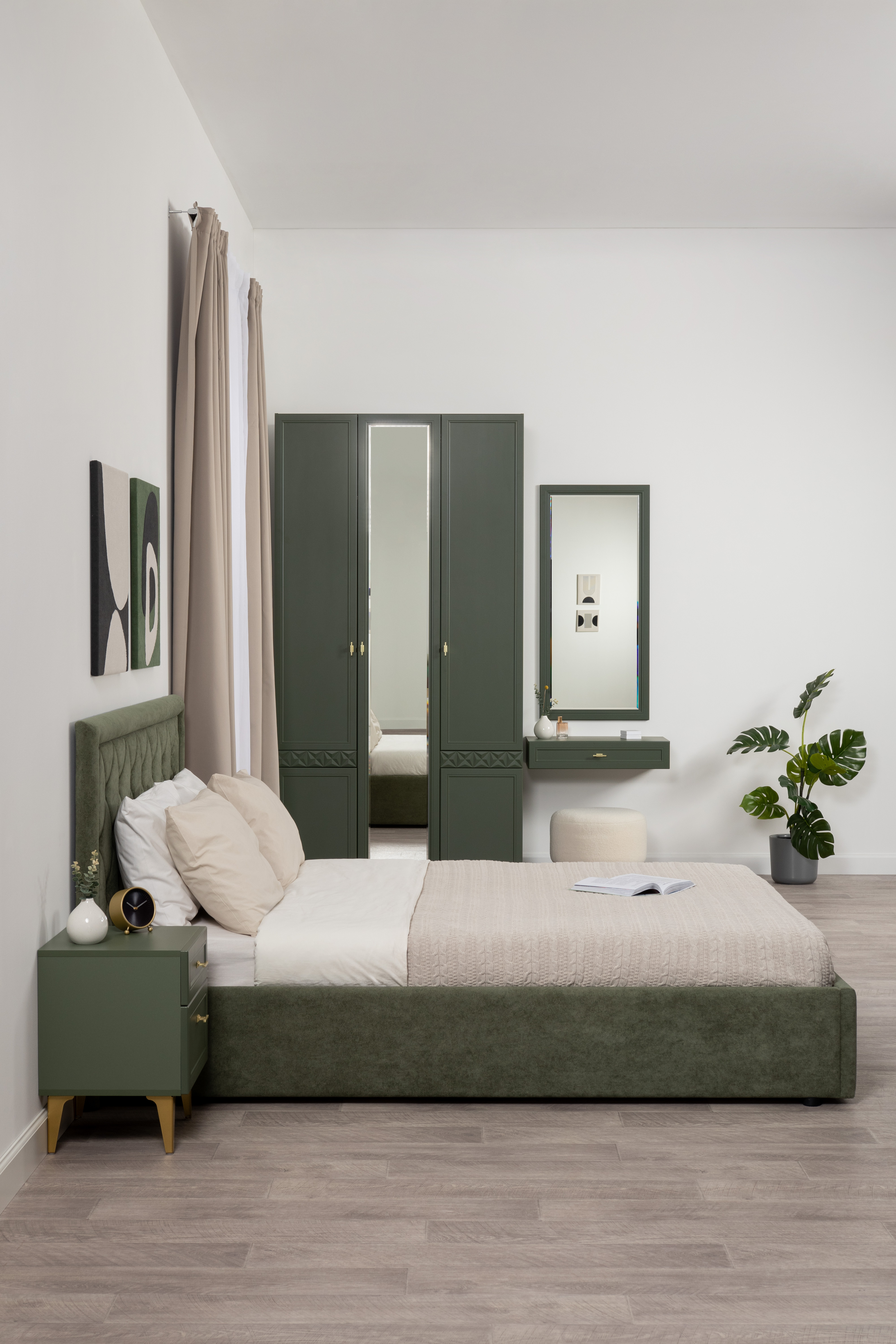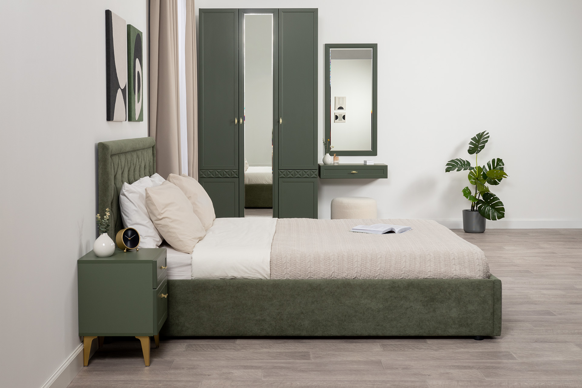 Изящные линии, глубокая фрезеровка фасадов из МДФ и благородные оттенки. Утончённая «Слоновая кость» и изысканная «Олива Шагрень» с глубоким зелёным тоном — создают атмосферу уюта, тепла и благородства. Металлические ручки и опоры золотого цвета придают мебели утончённый блеск, а петли и направляющие с доводчиками обеспечивают плавное и бесшумное закрытие фасадов.