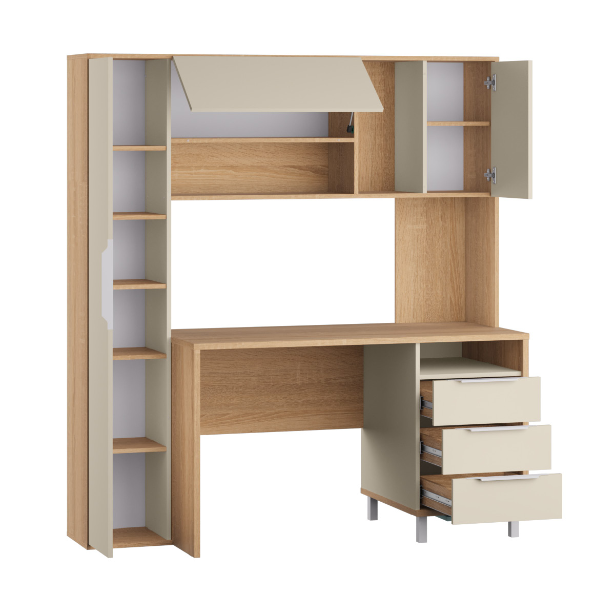 Большая рабочая зона. Распашные двери на четырёхшарнирных петлях. Выдвижные ящики на шариковых направляющих полного выдвижения. Верхний центральный фасад на газлифте, открывается за нижнюю часть фасада. Верхний правый фасад открывается за левую часть фасада. Регулируемые опоры: металл, белый матовый. Ручки: металл, белый матовый.