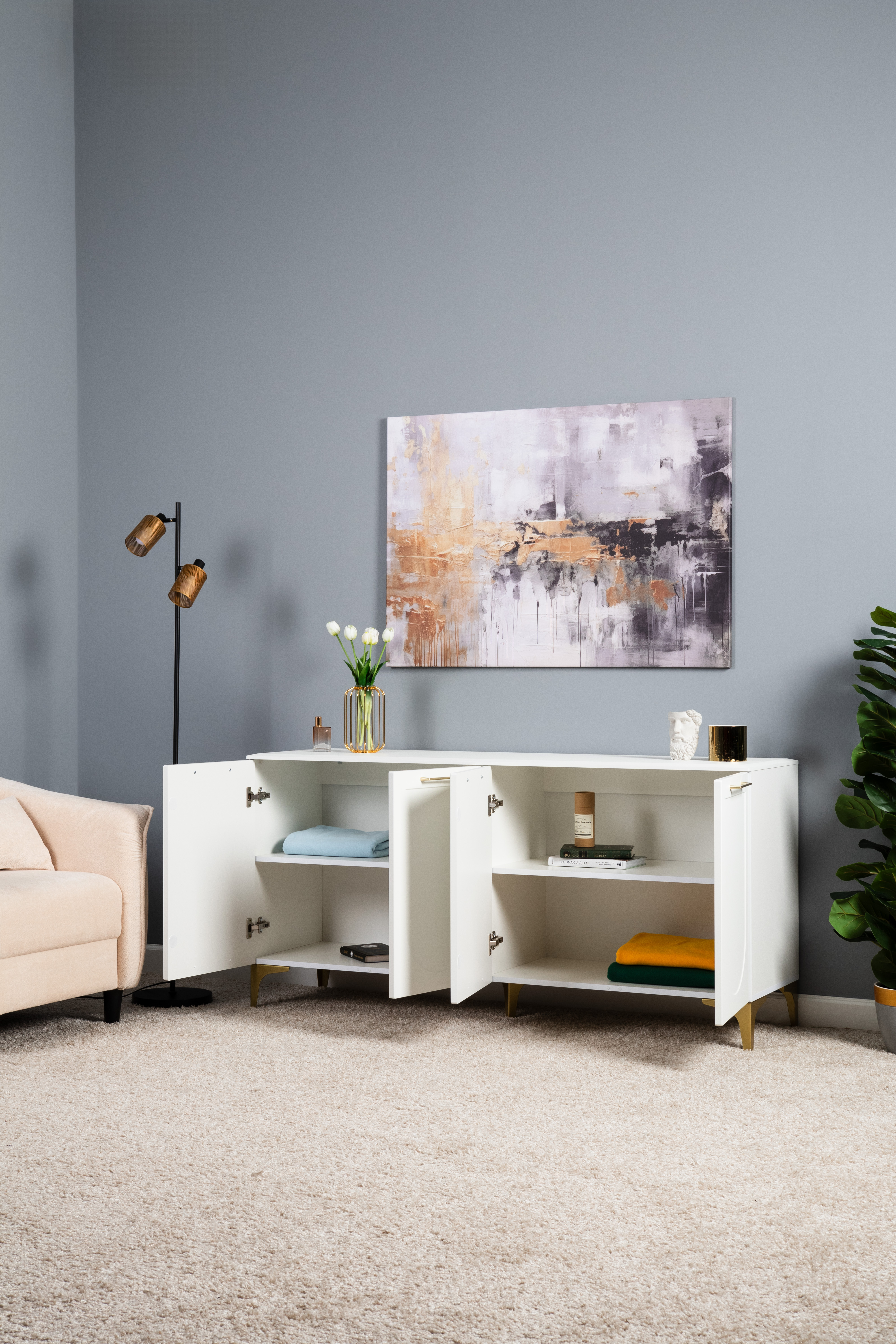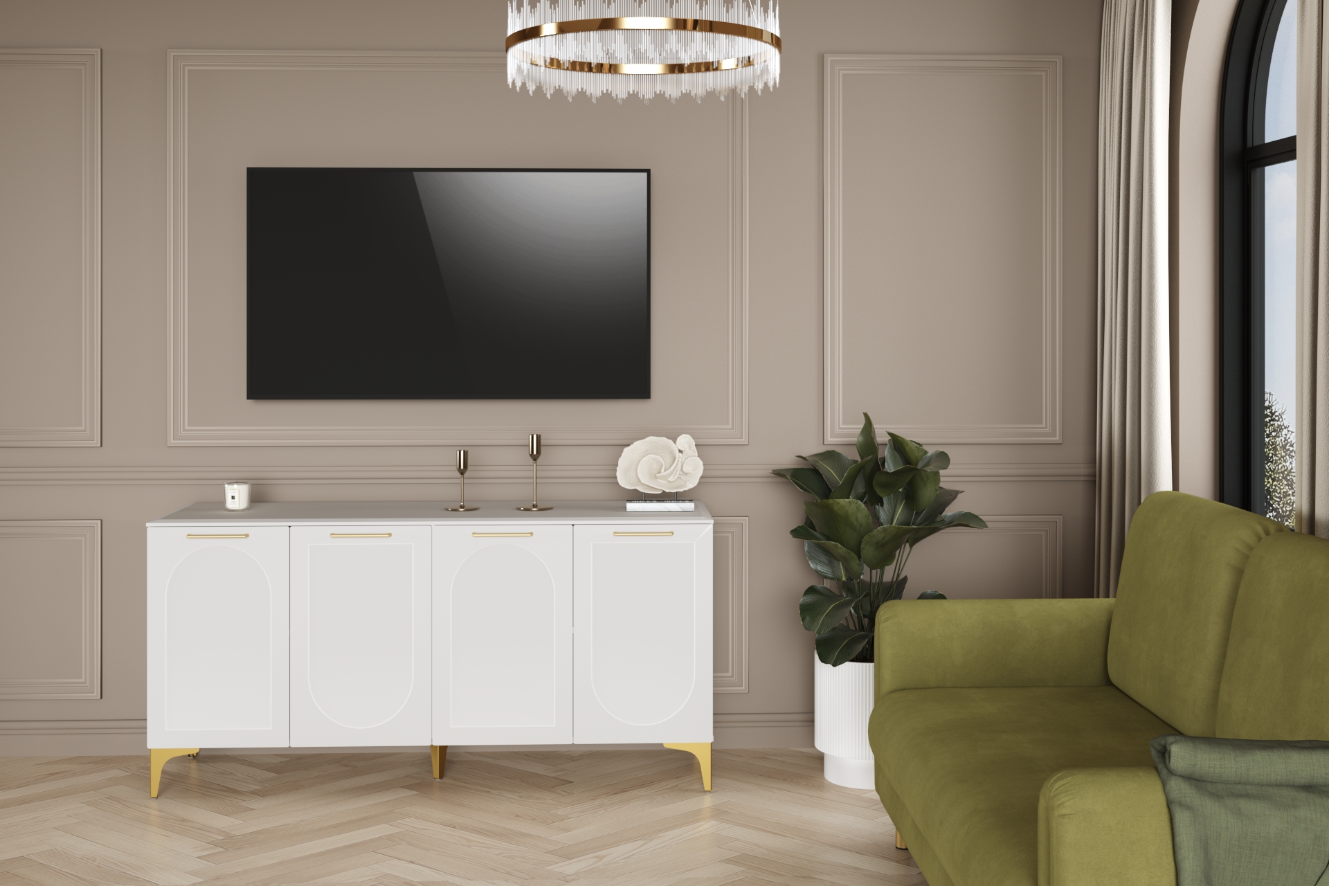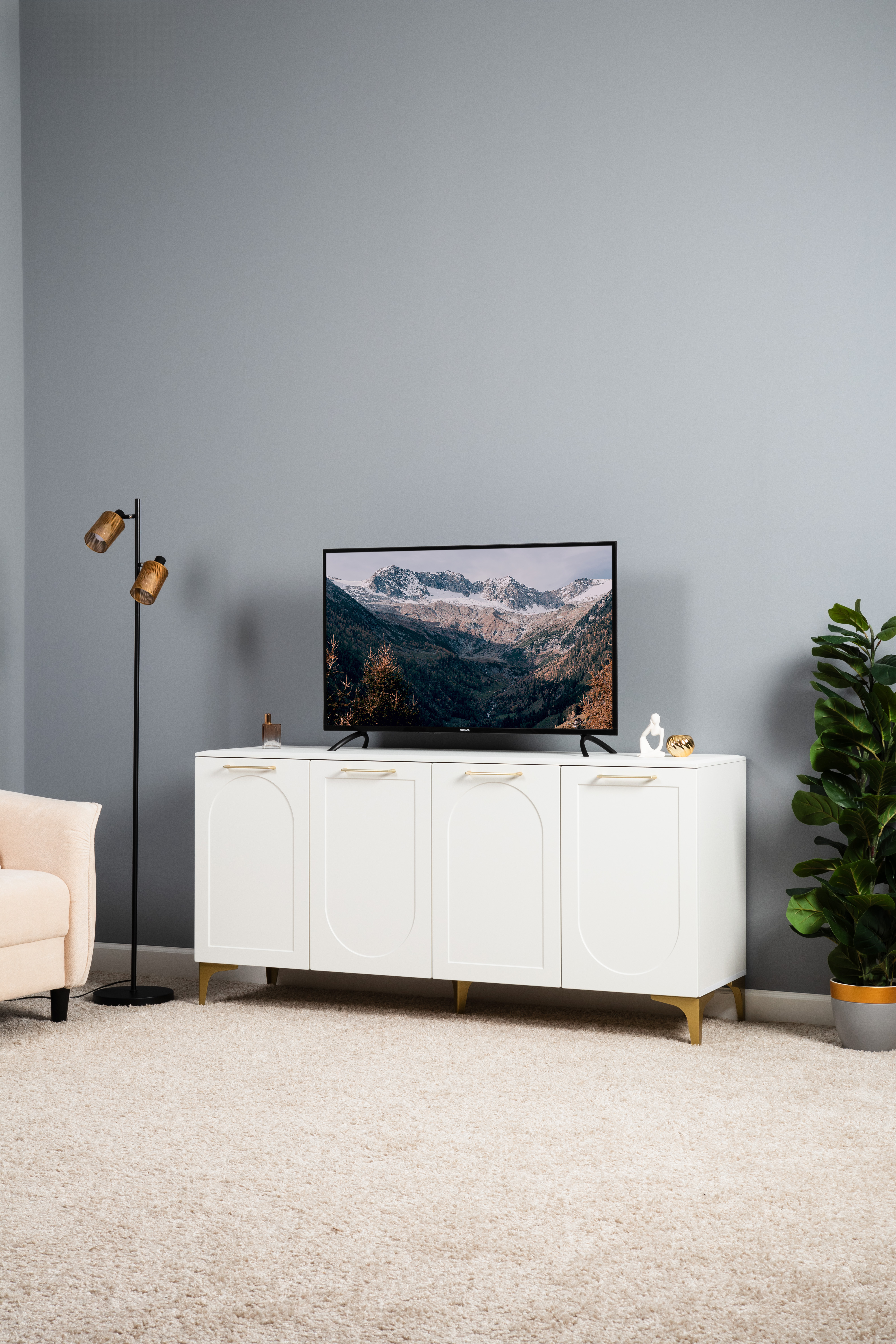 Тумба под ТВ в гостиную Петра 13.281 белый PE шагрень, милк софт ПВХ, бетон чикаго беж ПВХ