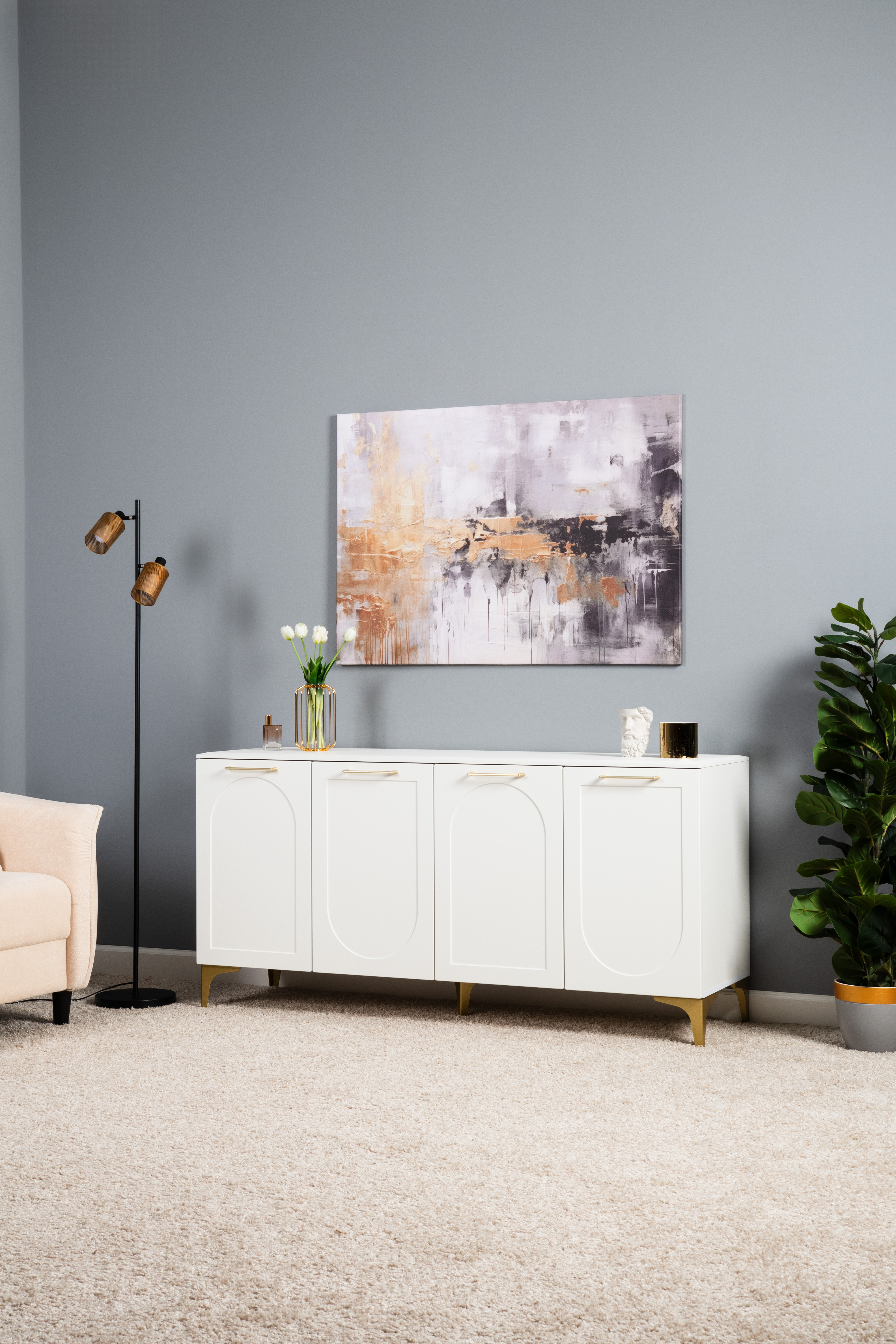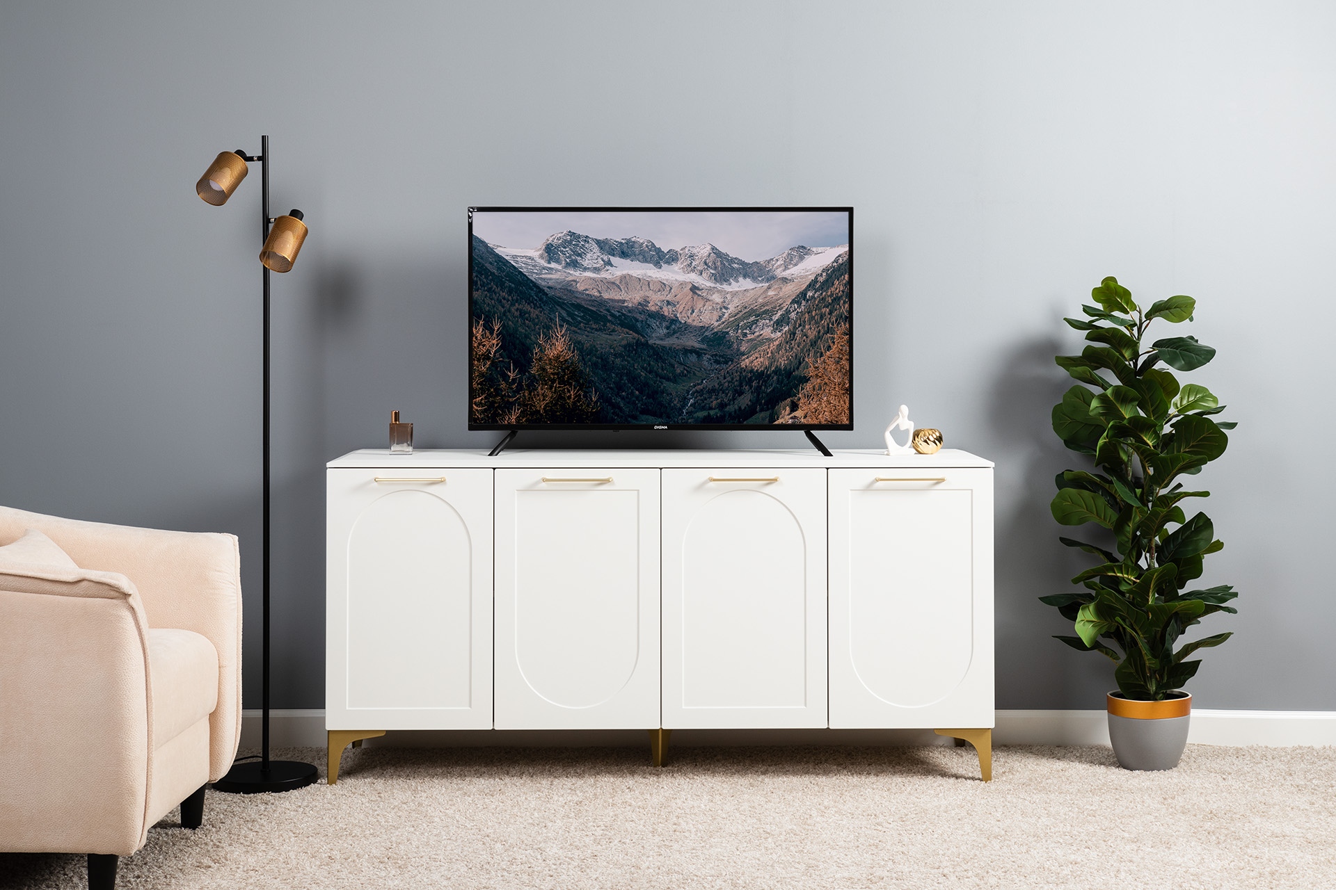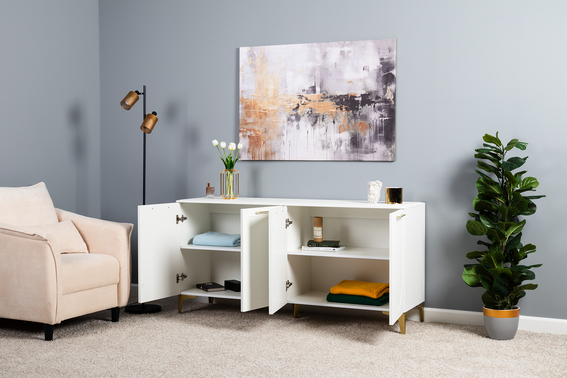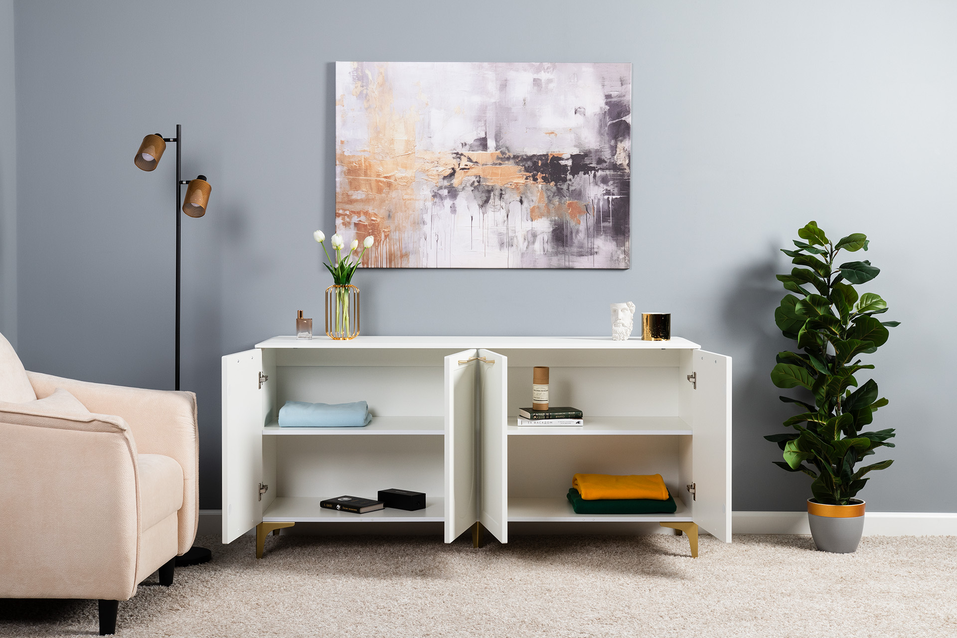 Тумба под ТВ в гостиную Петра 13.281 белый PE шагрень, милк софт ПВХ, бетон чикаго беж ПВХ