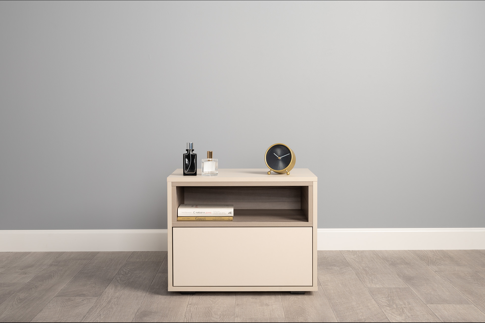 Благодаря нейтральному светлому оттенку и универсальности декора модули можно разместить в спальне, гостиной, прихожей.